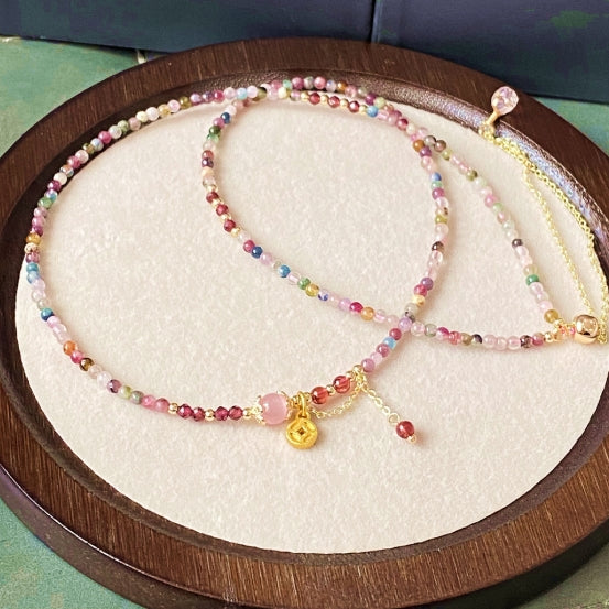 This chic three-layer piece—versatile enough to wear as a bracelet or necklace—celebrates love and promising prospects. Its soft pink tourmaline hues evoke tender emotion and invite affection, while garnet accents add a touch of Feng Shui luck for a bright future. Each layer harmoniously intertwines, creating a statement accessory that elevates your style and serves as a daily reminder of love and the possibilities ahead.